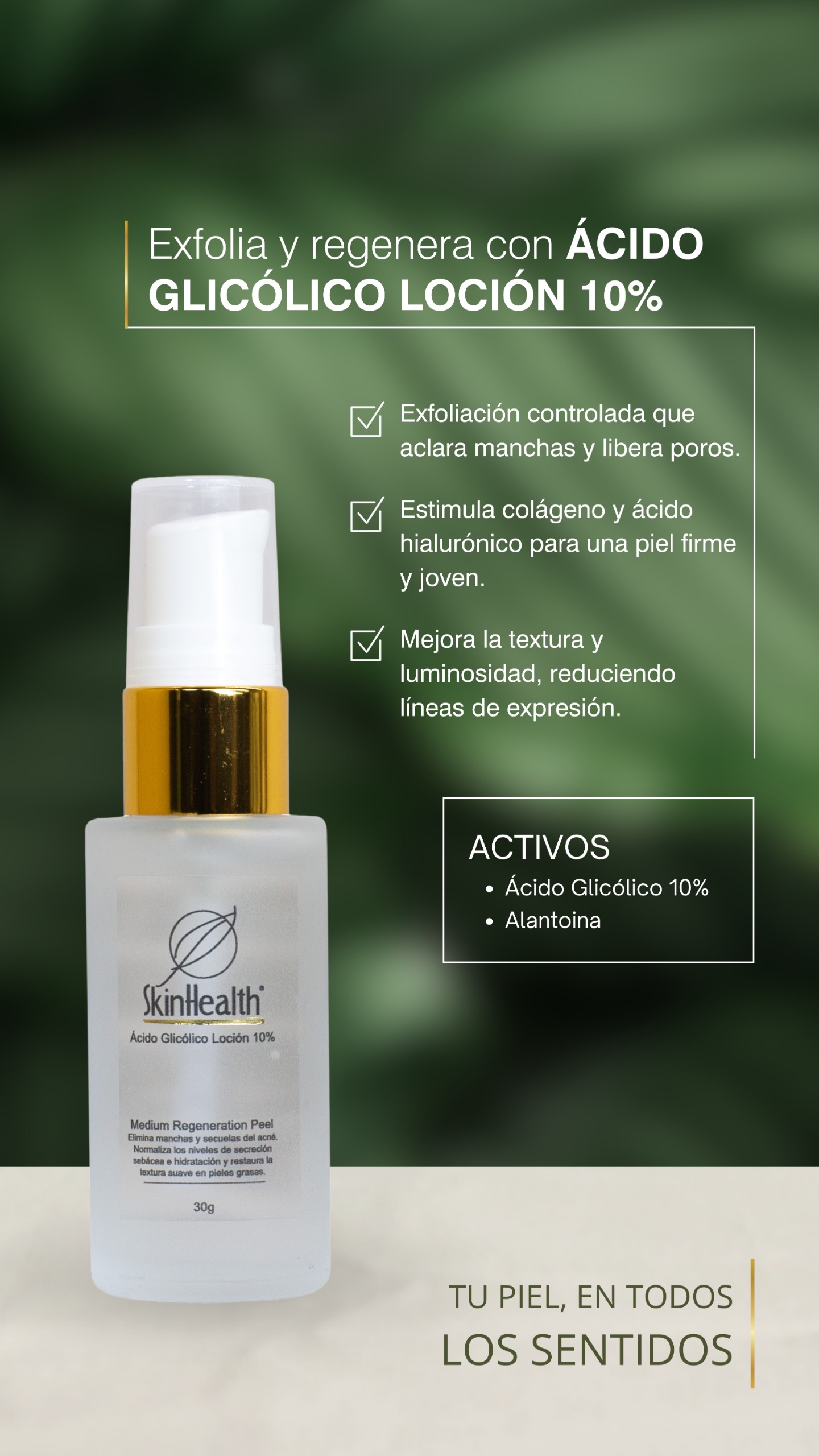 Loción con 10% de Ácido Glicólico y 0.2% de Alantoína. Recomendado para pieles mixtas a grasas.